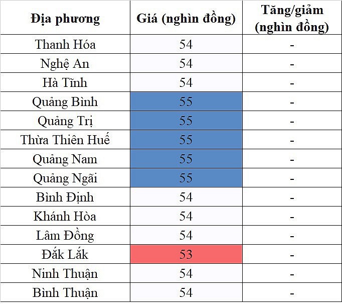 Ở chiều ngược lại, mức giá cao nhất khu vực 55.000 đồng/kg được ghi nhận tại Quảng Bình, Quảng Trị, Thừa Thiên Huế, Quảng Nam, Quảng Ngãi.