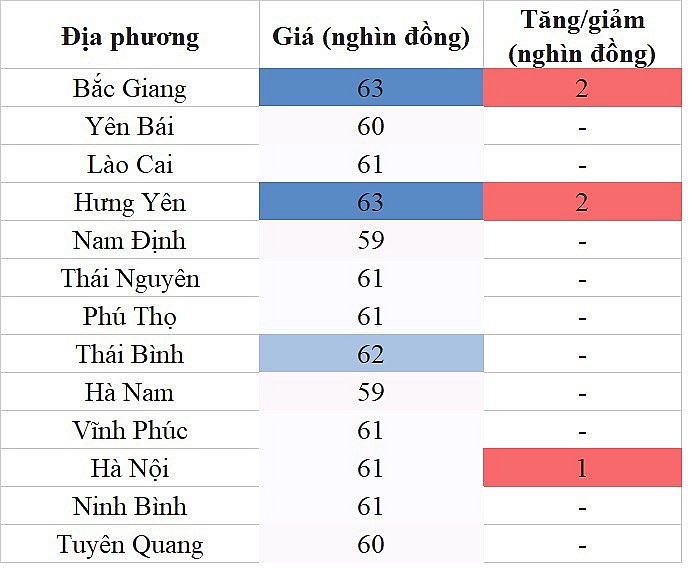 Các địa phương khác không khi nhận sự biến động mới về giá, trong đó, hiện Thái Bình ghi nhận giá heo hơi ở mức 62.000 đồng/kg, trong khi đó, mức giá thấp nhất khu vực 59.000 đồng/kg được ghi nhận tại Nam Định.