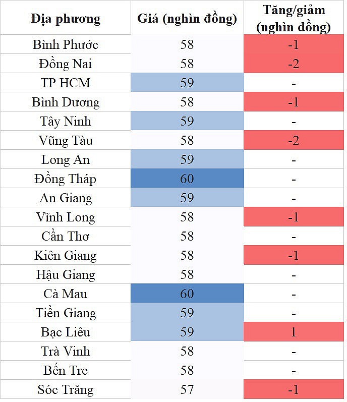 Ở chiều ngược lại, tỉnh Bạc Liêu tăng nhẹ 1.000 đồng/kg lên mức 59.000 đồng/kg.