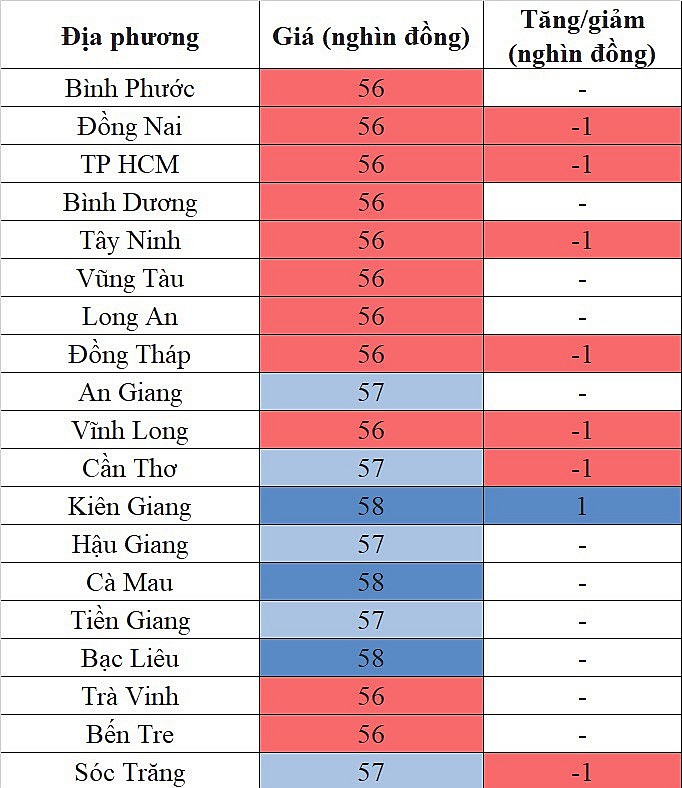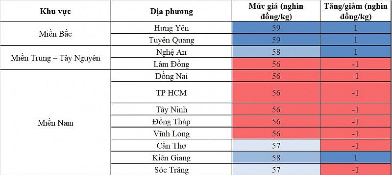 Theo đó, sau khi giảm 1.000 đồng/kg, 56.000 đồng/kg là mức giá được ghi nhận tại Đồng Nai, TP HCM, Tây Ninh, Đồng Tháp và Vĩnh Long.