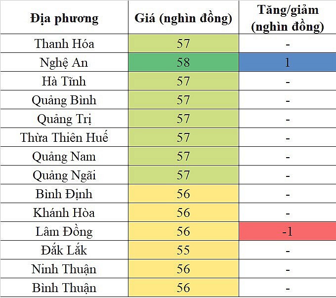 Các địa phương khác không ghi nhận sự biến động mới và dao động quanh mức 57.000 – 58.000 đồng/kg.