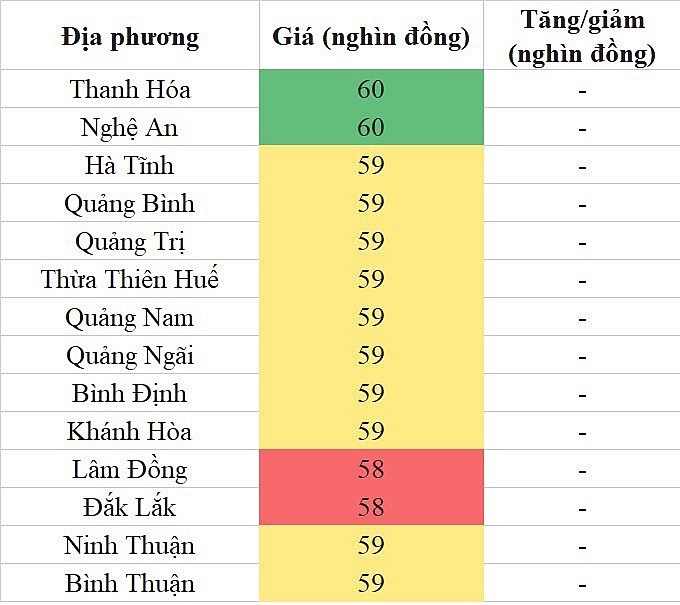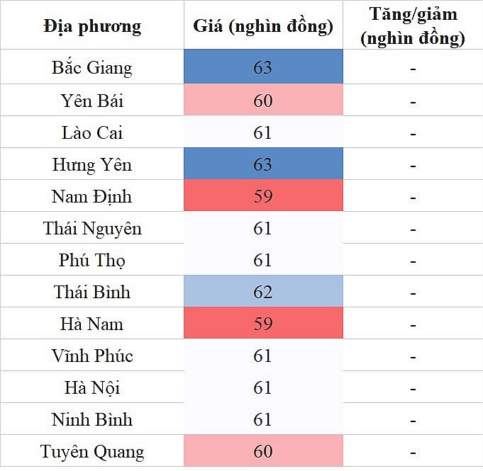 Ở chiều ngược lại, mức giá thấp nhất khu vực 59.000 đồng/kg được ghi nhận tại Nam Định, Hà Nam.