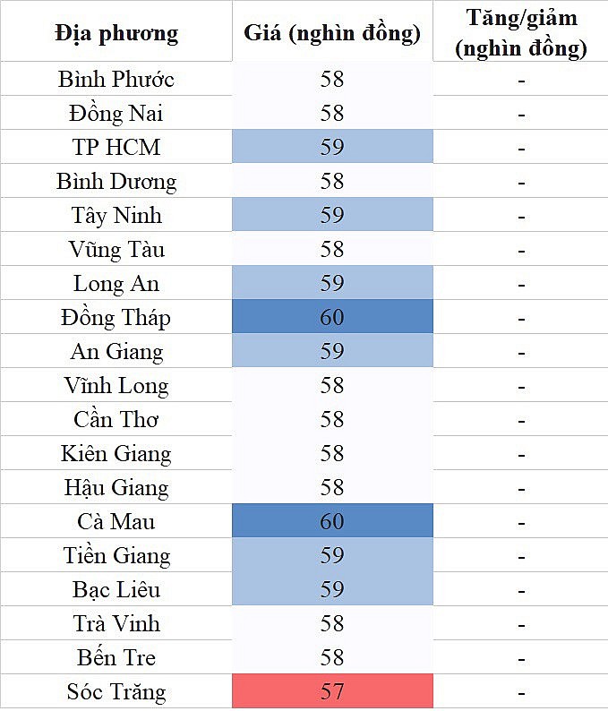 Ở chiều ngược lại, mức giá thấp nhất khu vực 57.000 đồng/kg được ghi nhận tại Sóc Trăng.
