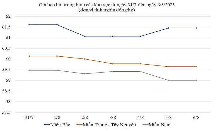Tính chung, trong tuần qua (từ 31/7/2023 đến 6/8/2023), giá heo hơi biến động không đồng nhất, trong đó, xu hướng giảm giá diễn ra phổ biến. Hiện, mức giá trung bình các khu vực vẫn ở ngưỡng xấp xỉ 60.000 đồng/kg. Cụ thể, trong ngày cuối tuần (6/8/2023), giá heo hơi trung bình khu vực miền Bắc đứng ở mức 61.460 đồng/kg; khu vực miền Trung – Tây Nguyên đứng ở mức 59.640 đồng/kg; khu vực miền Nam đứng ở mức 59.000 đồng/kg.
