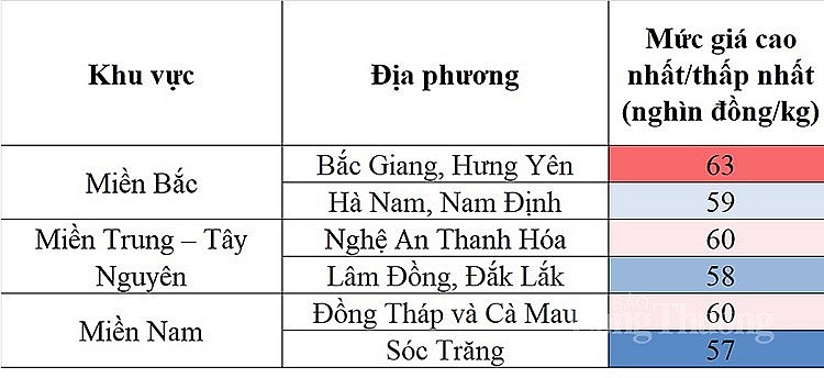 Ở chiều ngược lại, mức giá thấp nhất khu vực 57.000 đồng/kg được ghi nhận tại Sóc Trăng.