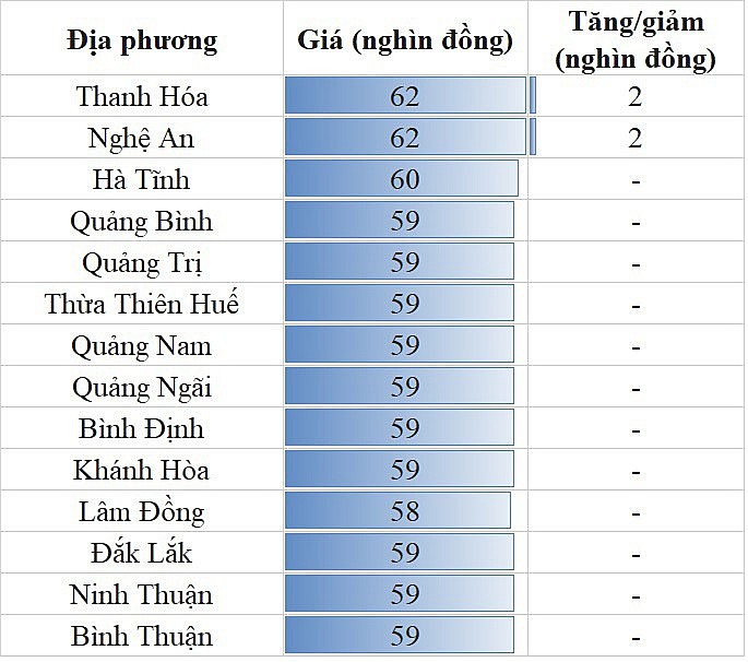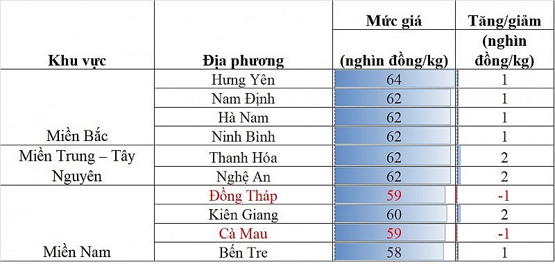 Các địa phương khác trong khu vực không ghi nhận sự biến động mới về giá, trong đó, mức giá thấp nhất khu vực 57.000 đồng/kg được ghi nhận tại Sóc Trăng.