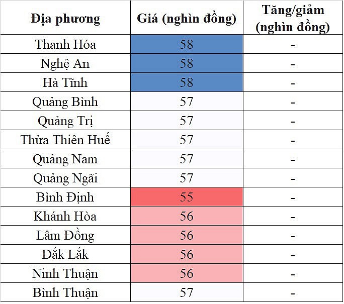 Ở chiều ngược lại, mức giá cao nhất khu vực 58.000 đồng/kg được ghi nhận tại Thanh Hóa, Nghệ An và Hà Tĩnh.