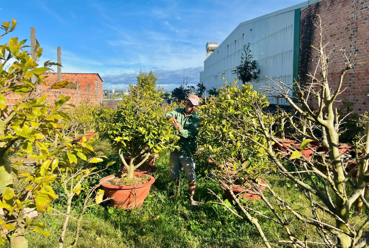 | Các nhà vườn trồng mai Gia Lai đang tất bật chăm sóc, tuốt lá cho các chậu mai nở hoa đúng thời điểm để phục vụ cho thị trường Tết Nguyên đán Ất Tỵ 2025 |