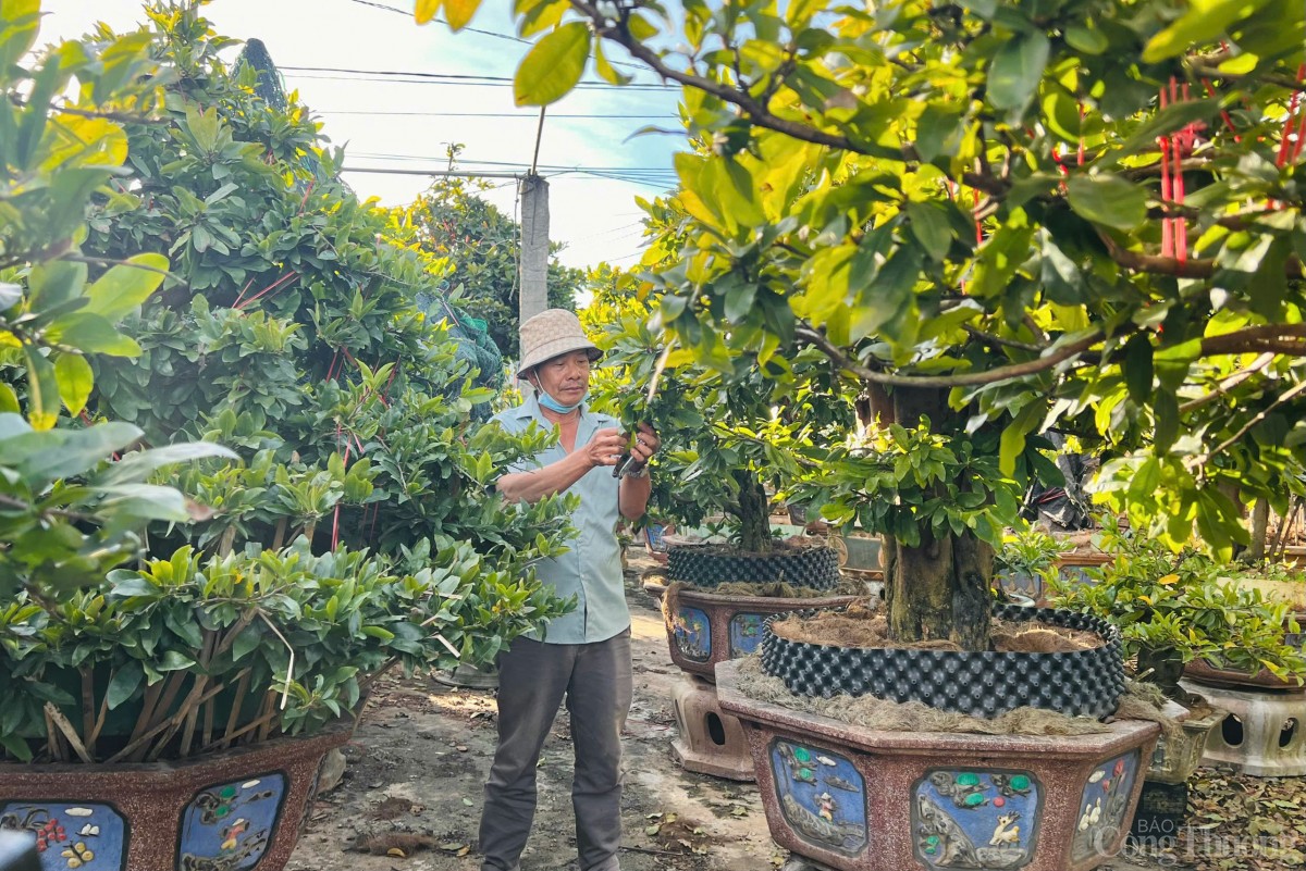 | Là người có thâm niên hơn 20 năm trồng mai cảnh tại địa phương, vườn mai của ông Hoà hiện có khoảng 2.000 gốc lớn nhỏ |