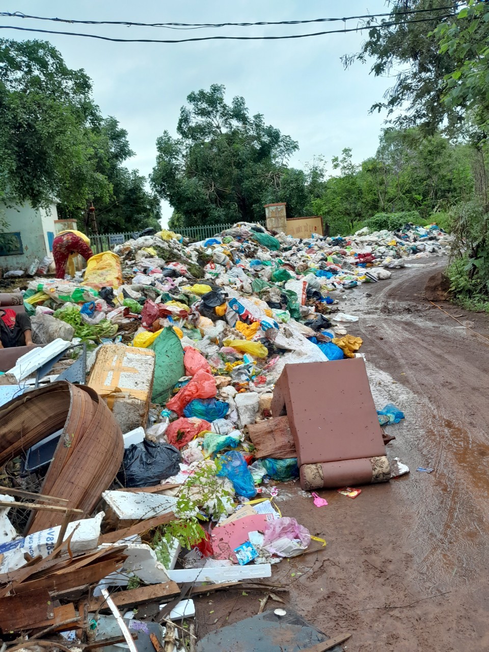 | Rác thải được đổ tràn lan trước cổng Nhà máy rác Chư Sê. (Ảnh: Hồng Phong) |