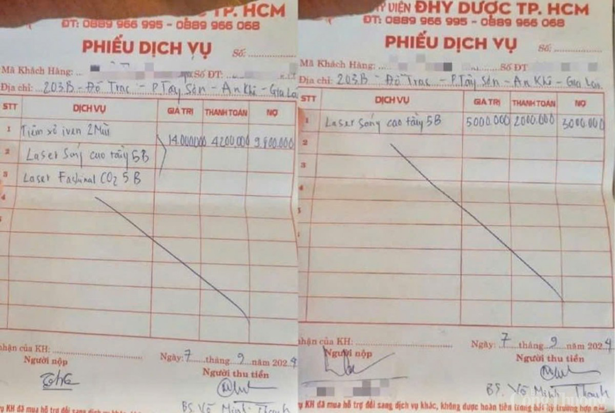 | Phiếu dịch vụ do "bác sĩ dỏm" Võ Minh Thanh kê. Ảnh: Hiền Mai |