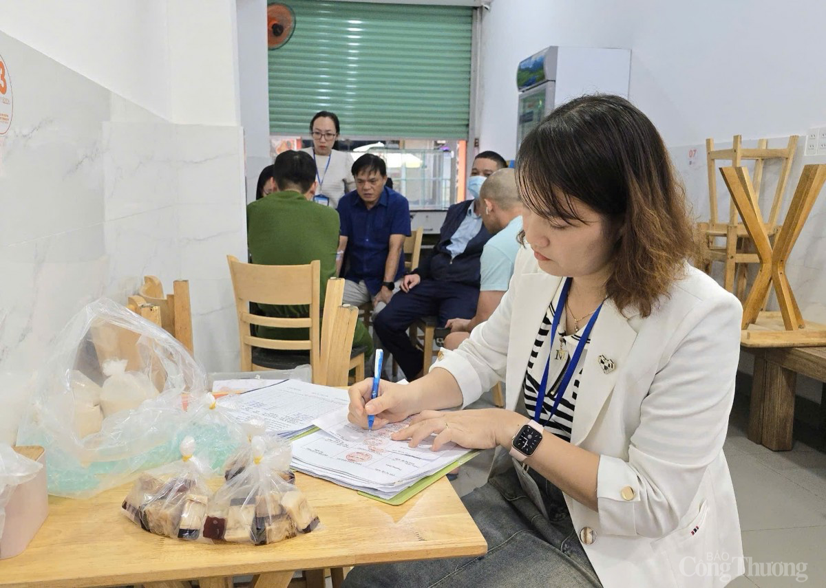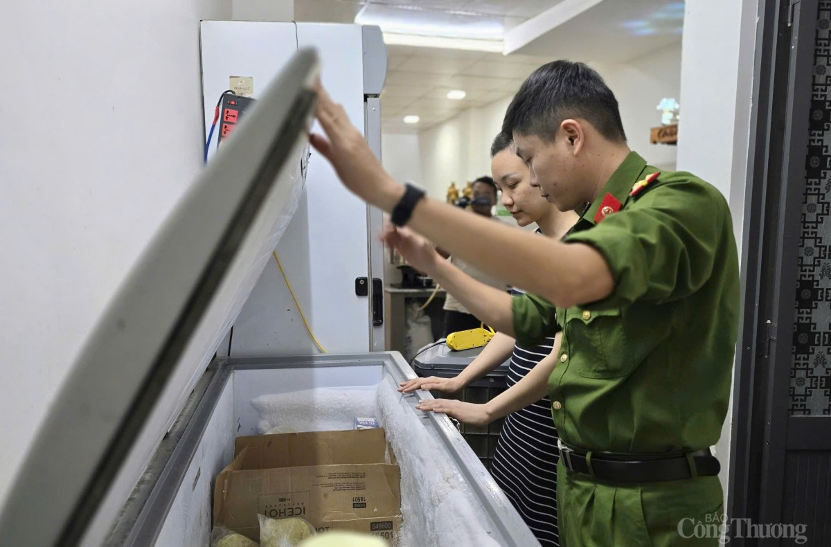 | Lực lượng chức năng kiểm tra, lấy mẫu ở tủ cấp đông của cửa hàng trà sữa. Ảnh: Thảo Nguyên |