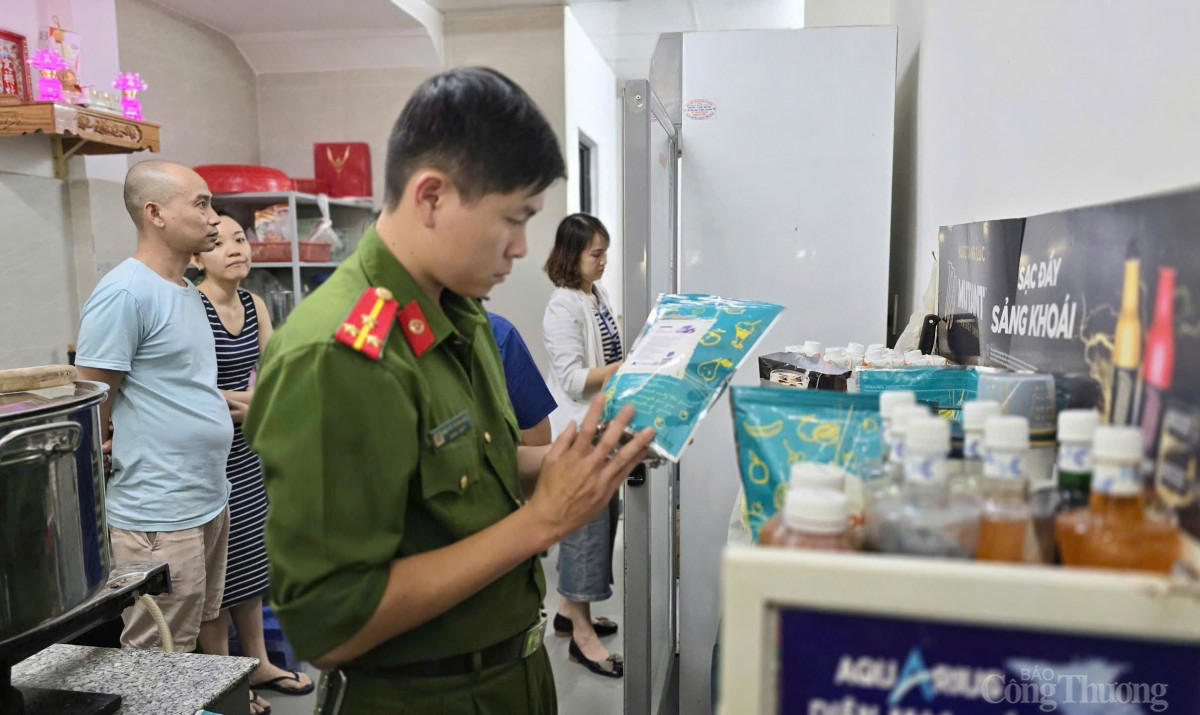 | Lực lượng Công an kiểm tra nhãn mác, bao bì, hạn sử dụng của sản phẩm. Ảnh: Thảo Nguyên |