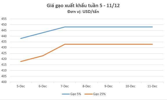 Trên thị trường xuất khẩu, giá gạo xuất khẩu chững lại và có xu hướng đi ngang sau phiên điều chỉnh tăng. Theo Hiệp hội Lương thực Việt Nam, giá chào bán gạo xuất khẩu 5% tấm đang ở mức 448 USD/tấn; gạo 25% tấm ở mức 433 USD/tấn.