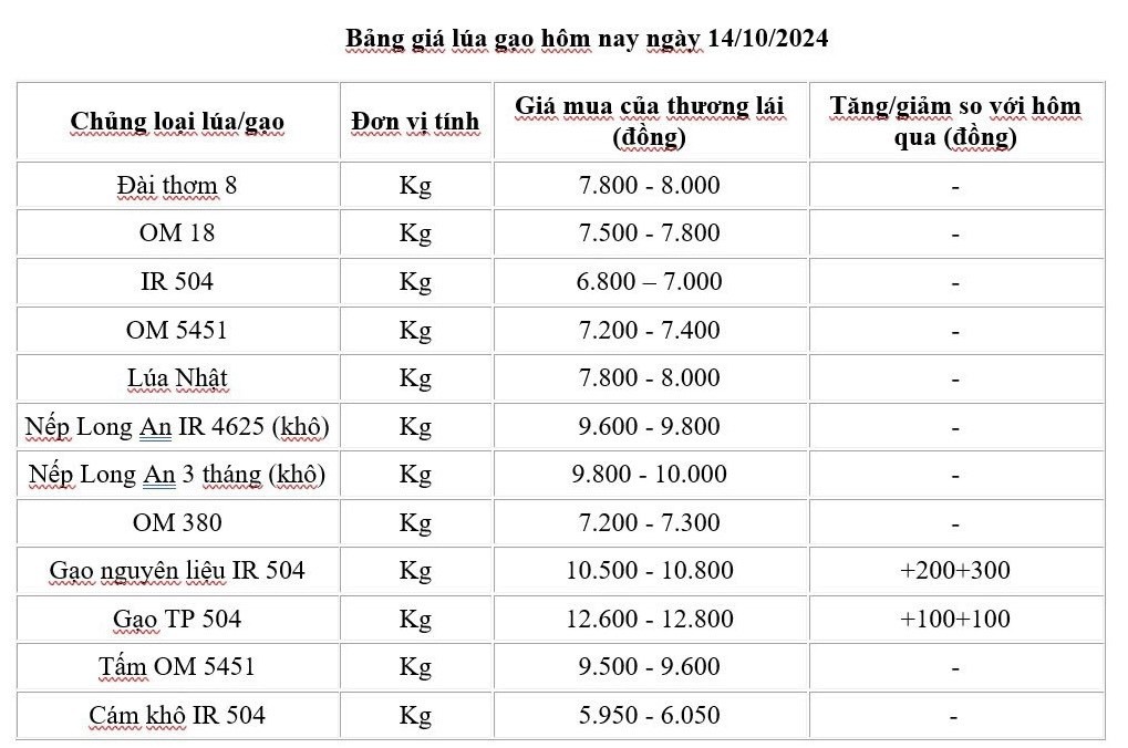 Giá lúa gạo hôm nay ngày 14/10/2024 tại khu vực Đồng bằng sông Cửu Long biến động với mặt hàng gạo. Giá gạo tăng 100 - 300 đồng/kg. Giá lúa duy trì ổn định.