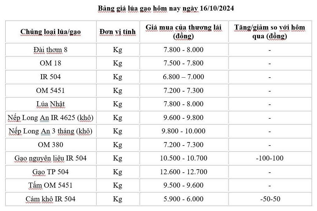 | Giá lúa gạo hôm nay 16/10/2024: Giá lúa ổn định, giá gạo trong nước giảm. |