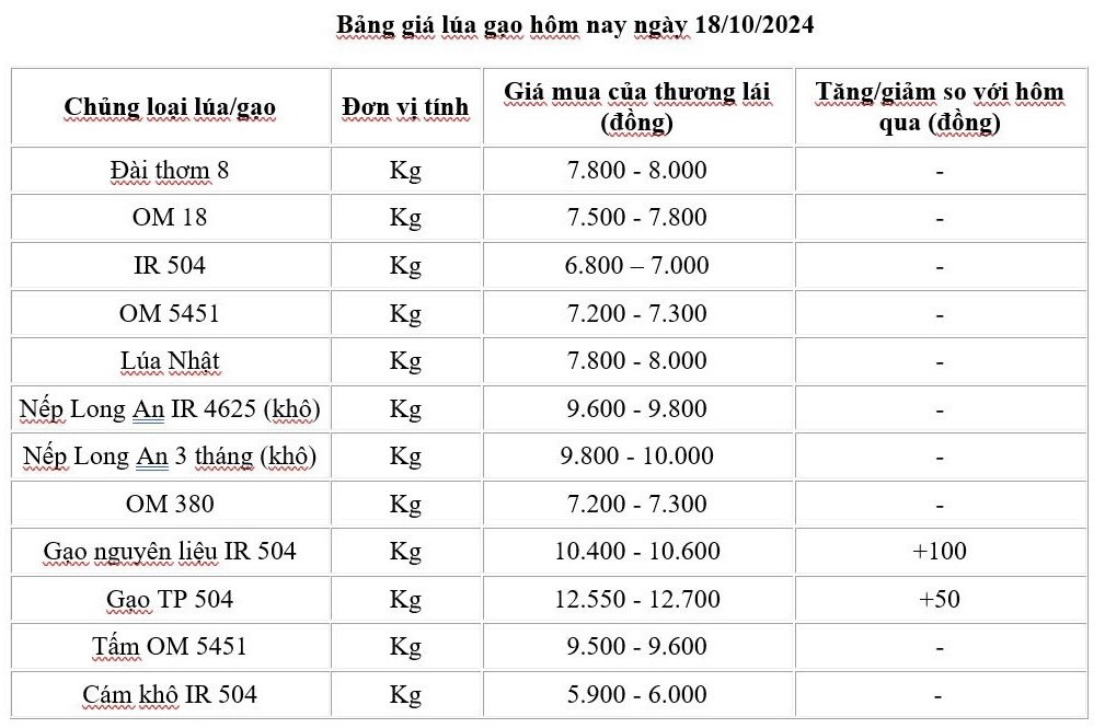 Giá lúa gạo hôm nay ngày 18/10/2024 tại khu vực Đồng bằng sông Cửu Long biến động với mặt hàng gạo. Giá gạo tăng nhẹ 100 đồng/kg. Giá lúa duy trì ổn định.
