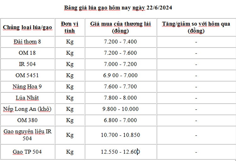 Giá lúa gạo hôm nayngày 22/6 tại khu vựcĐồng bằng sông Cửu Long tiếp tục xu hướng đi ngang.