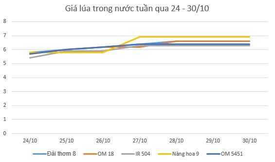 Với các chủng loại lúa còn lại, giá đi ngang. Hiện lúa IR 504 ở mức 6.200 – 6.300 đồng/kg; Đài thơm 8 6.300 – 6.400 đồng/kg; lúa OM 5451 mức 6.300 – 6.400 đồng/kg; nếp An Giang (tươi) 5.900 – 6.100 đồng/kg; nếp Long An (tươi) 6.200 – 6.500 đồng/kg. Nếp An Giang khô đang được thương lái thu mua ở mức 8.400 – 8.500 đồng/kg; nếp Long An khô 8.700 – 9.100 đồng/kg; nàng hoa 9 6.600 – 6.800 đồng/kg; lúa IR 504 khô duy trì ở mức 6.500 đồng/kg.
