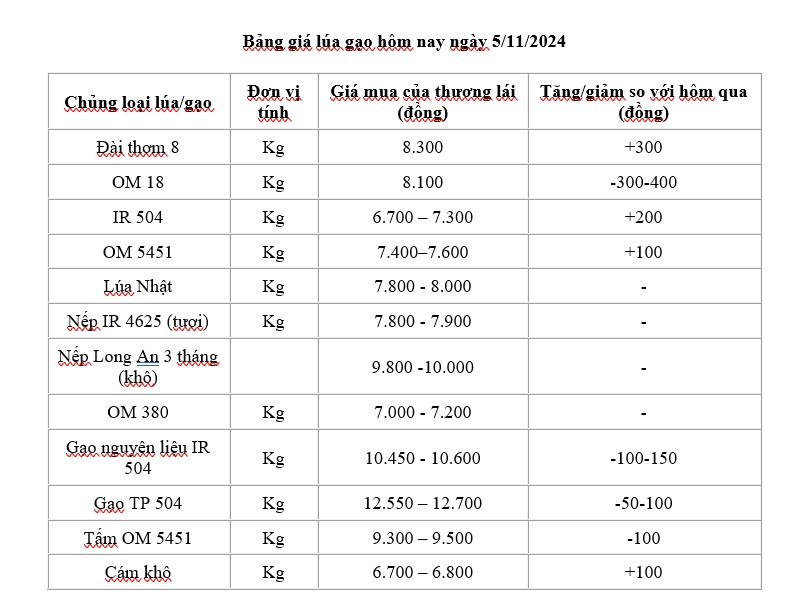 | Giá lúa gạo hôm nay 5/11/2024: Giá lúa tăng, giảm trái chiều; giá gạo giảm 50 - 150 đồng/kg |
