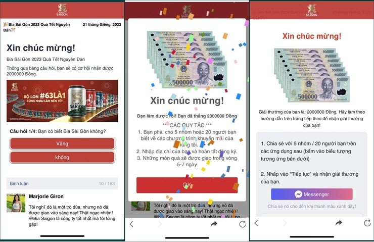 Cụ thể, các đối tượng lừa đảo đã lợi dụng hình ảnh thương hiệu Bia Sài Gòn để tạo ra các chiêu trò lừa đảo trúng thưởng ngày Tết nhằm đánh vào tâm lý của những người dùng không rành về internet và bảo mật tài khoản cá nhân.