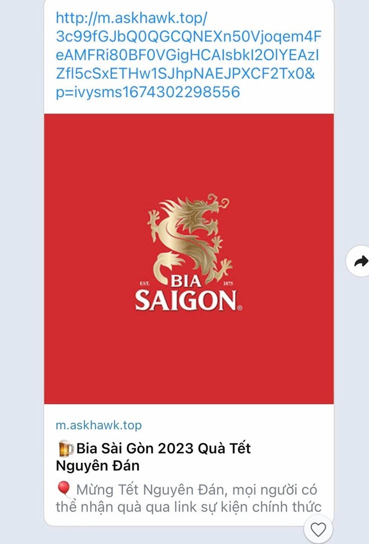 Dịp Tết Nguyên đán Quý Mão 2023 đã xuất hiện chiêu thức lừa đảo hết sức tinh vi bằng cách mạo danh hình ảnh Bia Sài Gòn để lừa đảo, nhanh chóng phát tán mạnh mẽ qua nền tảng mạng xã hội Zalo và Messenger.