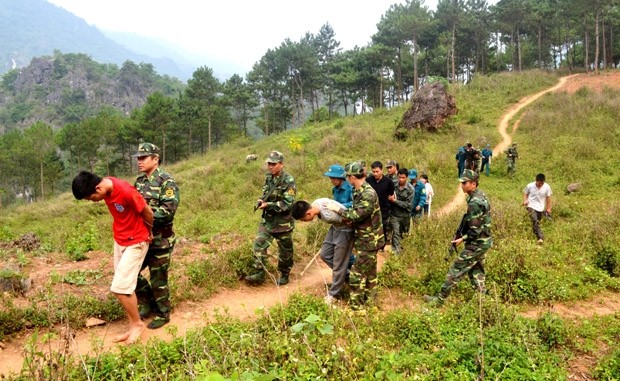 | Lực lượng chức năng diễn tập xử trí tình huống mua, bán người tại thôn Giang Nam, xã Thanh Thủy (Vị Xuyên). Ảnh: Báo Hà Giang |