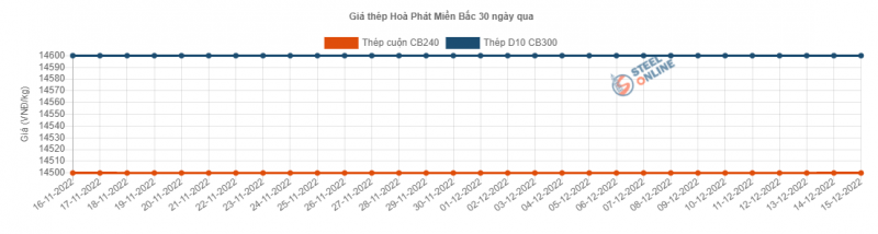 Thương hiệu thép Hòa Phát giữ nguyên giá bán, với dòng thép cuộn CB240 ở mức 14.500 đồng/kg; thép thanh vằn D10 CB300 có giá 14.600 đồng/kg.