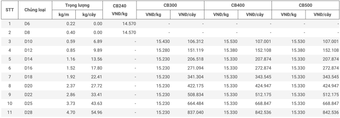 Thép Pomina, với dòng thép cuộn CB240 ở mức 15.280 đồng/kg; thép thanh vằn D10 CB300 có giá 15.480 đồng/kg.