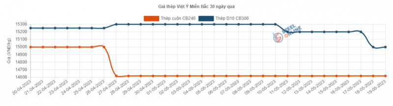 Thép Việt Ý, hiện thép cuộn CB240 giữ ở mức 14.620 đồng/kg; thép thanh vằn D10 CB300 giảm 200 đồng, có giá 15.000 đồng/kg.