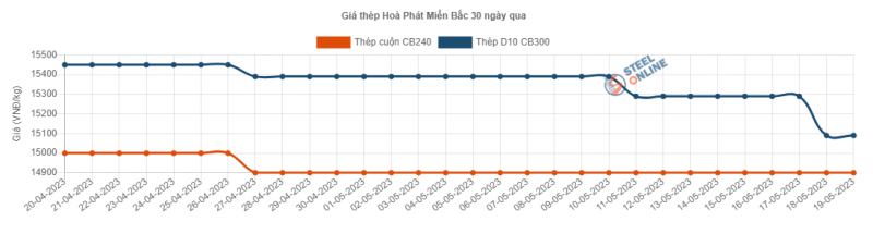 Thép Hòa Phát, với thép cuộn CB240 ở mức 14.920 đồng/kg; thép thanh vằn D10 CB300 giảm 200 đồng, có giá 15.250 đồng/kg.