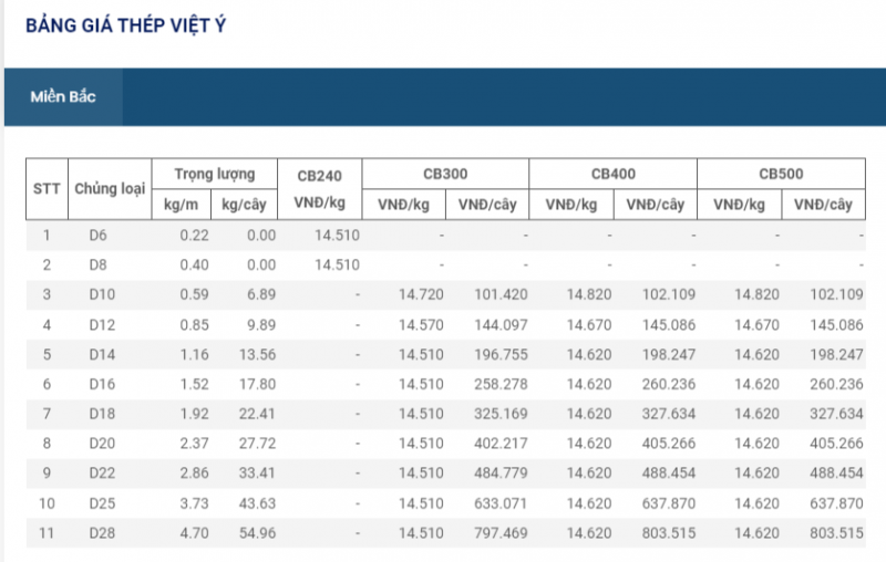 Thương hiệu thép Việt Ý, hiện thép cuộn CB240 ở mức 14.510 đồng/kg; dòng thép thanh vằn D10 CB300 có giá 14.720 đồng/kg.