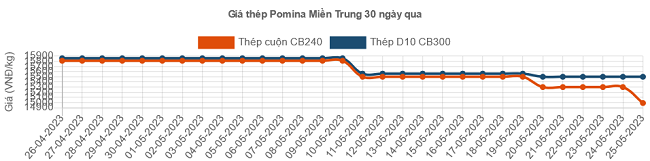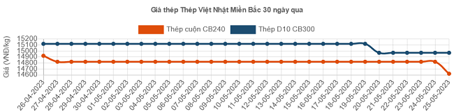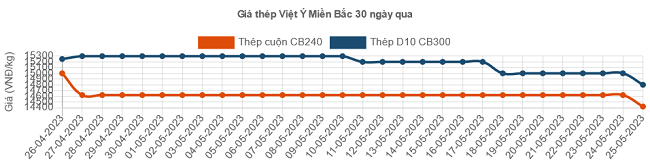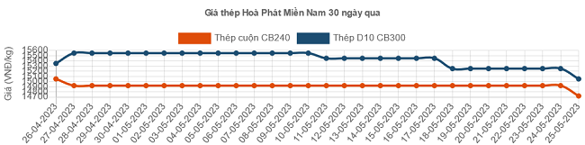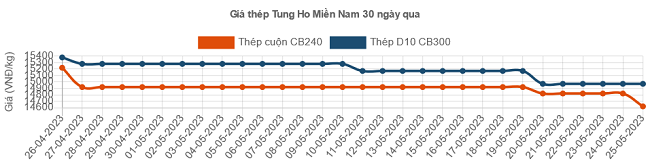 Ngày 25/5/2023, giá thép xây dựng trong nước tiếp tục được các doanh nghiệp điều chỉnh giảm thêm từ 200 - 510 đồng/kg. Hiện giá thép xoay quanh mức 14.360 - 15.500 đồng/kg (tùy từng sản phẩm và thương hiệu).