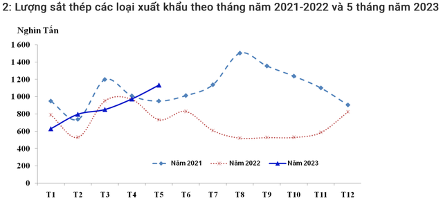 Biểu đồ lượng sắt thép các loại xuất khẩu theo tháng năm 2021-2022 và 5 tháng 2023. Nguồn: Tổng cục Hải quan
