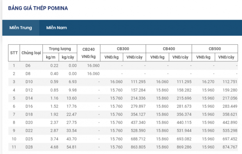 Thép Pomina, với dòng thép cuộn CB240 ở mức 15.960 đồng/kg; thép thanh vằn D10 CB300 có giá 15.860 đồng/kg.