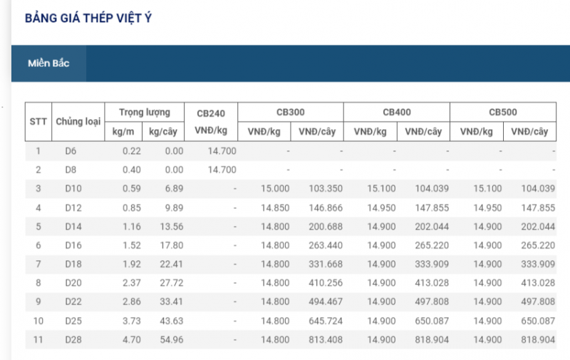 Thương hiệu thép Việt Ý, hiện thép cuộn CB240 ở mức 14.700 đồng/kg; dòng thép thanh vằn D10 CB300 có giá 15.000 đồng/kg.