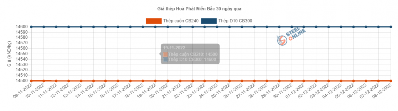 Thương hiệu thép Hòa Phát giữ nguyên giá thép đã điều chỉnh trước đó, với dòng thép cuộn CB240 giảm 210 đồng từ ngày 12/10, xuống mức 14.500 đồng/kg; thép thanh vằn D10 CB300 giảm sâu 700 đồng, có giá 14.600 đồng/kg. Các mức giá này vẫn giữ nguyên cho đến hôm nay (8/12).