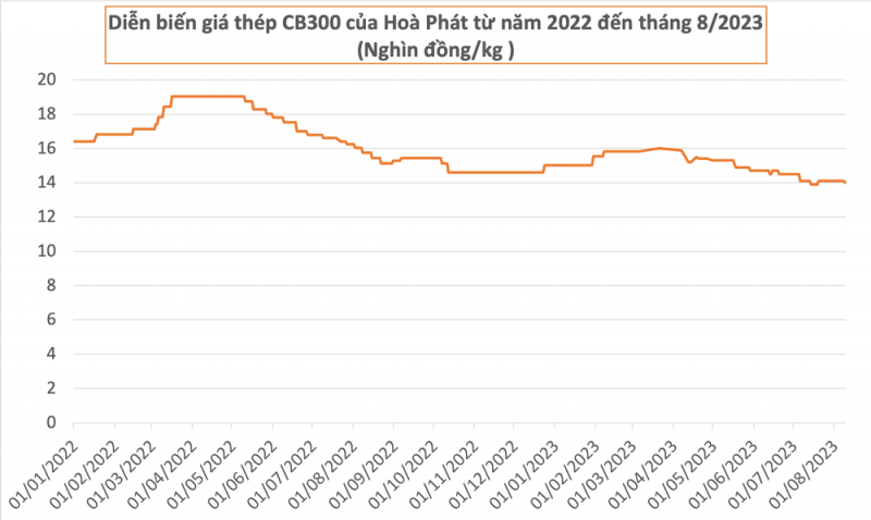 | Diễn biến giá thép CB300 của Hòa Phát từ tháng 1/2022 đến tháng 8/2023. Nguồn: Steel online. |