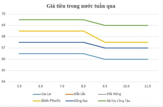 Giá tiêu hôm nay 11/9 tại thị trường trong nước tiếp tục xu hướng đi ngang. Cụ thể, tại Bà Rịa Vũng Tàu giá tiêu đang được thương lái thu mua ở mức 69.000 đồng/kg. Tại tỉnh Đắk Lắk, Đắk Nông giá tiêu hôm nay ở mức 67.000 đồng/kg. Tại Gia Lai giá tiêu dao động quanh mốc 66.000 đồng/kg. Tại Đồng Nai, giá tiêu hôm nay ở mức 67.000 đồng/kg. Tại Bình Phước, giá tiêu hôm nay được thu mua với mức 67.500 đồng/kg.