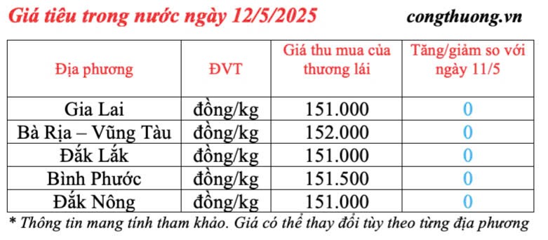 | Giá tiêu trong nước cập nhật sáng ngày 12/5/2025 |