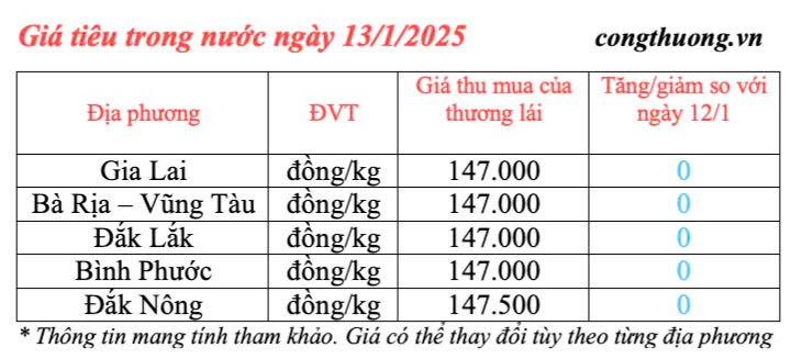 | Giá tiêu trong nước cập nhật ngày 13/1/2025 |
