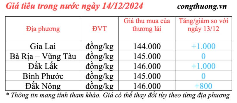 Giá tiêu hôm nay được cập nhật sáng ngày 14/12/2024 như sau, giá tiêu ổn định ở mức cao và tăng nhẹ từ 8.00 - 1.000 đồng/kg so ngày hôm trước, tuỳ từng địa phương. Hiện giá mua trung bình ở các địa phương ở mức 145.200 đồng/kg.