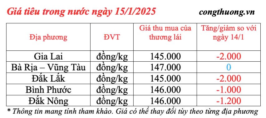 Giá tiêu hôm nay được cập nhật lúc 4h30 sáng ngày 15/1/2025 như sau, thị trường tiêu trong nước sau nhiều phiên giảm liên tiếp đã quay về quanh mức 145.000 - 147.000 đồng/kg; hiện giá tiêu tại các địa phương trọng điểm được thu mua ở mức 145.800 đồng/kg.
