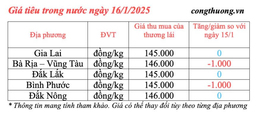 | Giá tiêu trong nước cập nhật ngày 16/1/2025 |