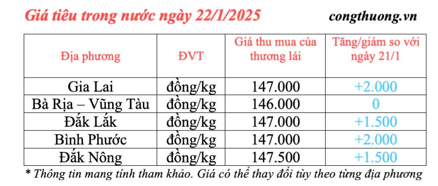 | Giá tiêu trong nước cập nhật ngày 22/1/2025 |