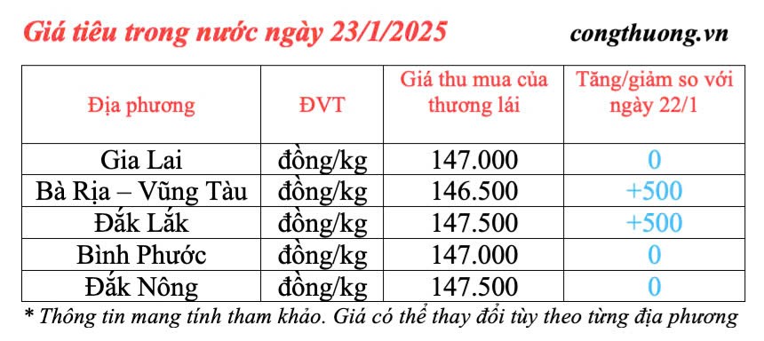 | Giá tiêu trong nước cập nhật ngày 23/1/2025 |