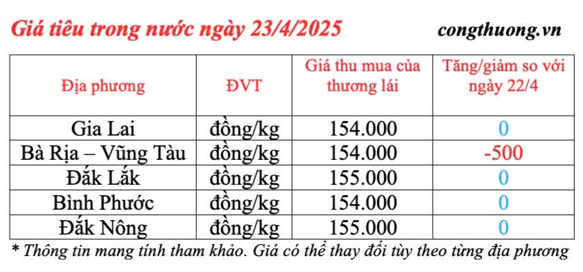 | Giá tiêu trong nước cập nhật sáng ngày 23/4/2025 |