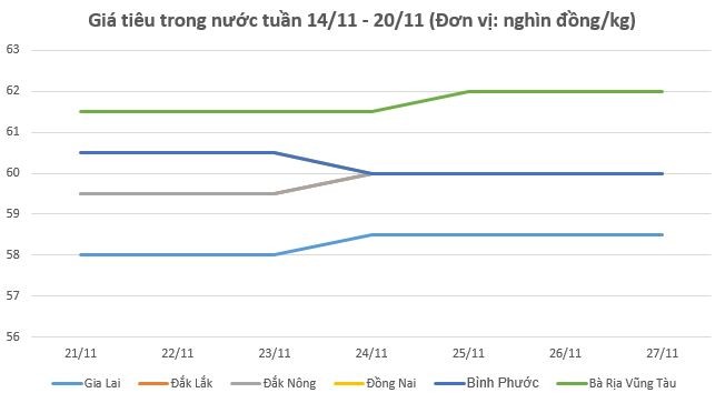 Tương tự, tại các địa phương còn lại, giá tiêu đi ngang sau phiên điều chỉnh tăng hôm qua. Cụ thể, tại Gia Lai giá tiêu hôm nay được thương lái thu mua ở mức 58.500 đồng/kg. Tại Đắk Lắk, Đắk Nông giá tiêu hôm nay duy trì ở mức 60.000 đồng/kg. Tương tự, tại Đồng Nai, Bình Phước giá tiêu ở mức 61.000 đồng/kg.