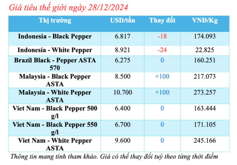 | Cập nhật giá tiêu thế giới hôm nay ngày 28/12/2024 |
