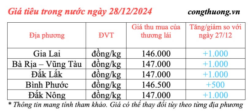 | Giá tiêu trong nước cập nhật ngày 28/12/2024 |